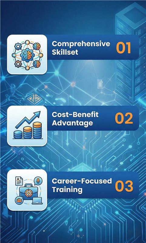 Instead of learning one isolated tool, students learn the entire ecosystem. For example, the Network Engineer Master Program covers routing, switching, and security (Palo Alto), making the student 3x more employable than someone with just a CCNA.